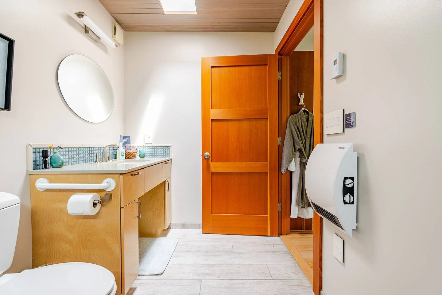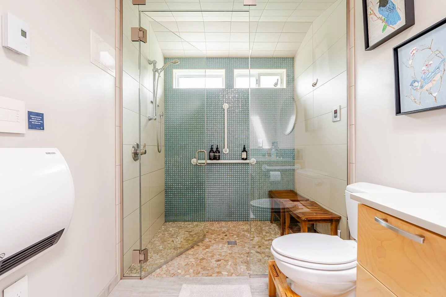 Our simple bathroom features an ADA-accessible walk-in shower with chairs, complemented by Aesop shampoo, conditioner, and body soap. A hairdryer is provided, along with a toothbrush and toothpaste in case you forget yours.
